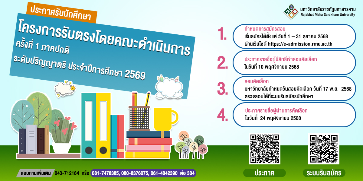ด้วยมหาวิทยาลัยราชภัฏมหาสารคาม มีความประสงค์จะรับนักศึกษาเข้าศึกษาต่อ โครงการรับตรงโดยคณะดำเนินการ ครั้งที่ 1 ภาคปกติ ประจำปีการศึกษา 2569 ระดับปริญญาตรี 4 ปี ระดับปริญญาตรี 4 ปีเทียบเข้า ระดับปริญญาตรี 2 ปี ต่อเนื่อง หลักสูตรครุศาสตรบัณฑิต (ค.บ.) หลักสูตรวิทยาศาสตรบัณฑิต (วท.บ.) หลักสูตรศิลปศาสตรบัณฑิต (ศศ.บ.) หลักสูตรวิศวกรรมศาสตรบัณฑิต (วศ.บ.) หลักสูตรเทคโนโลยีบัณฑิต (ทล.บ.) หลักสูตรศิลปบัณฑิต (ศล.บ.) หลักสูตรบริหารธุรกิจบัณฑิต (บธ.บ.) หลักสูตรเศรษฐศาสตรบัณฑิต (ศ.บ.) หลักสูตรนิเทศศาสตรบัณฑิต (นศ.บ.) หลักสูตรนิติศาสตรบัณฑิต (น.บ.) หลักสูตรรัฐประศาสนศาสตรบัณฑิต (รป.บ.) หลักสูตรรัฐศาสตรบัณฑิต (ร.บ.) หลักสูตรบัญชีบัณฑิต (บช.บ.) และหลักสูตรดุริยางคศาสตรบัณฑิต (ดศ.บ.) โดยมีรายละเอียดการรับสมัครตามประกาศ