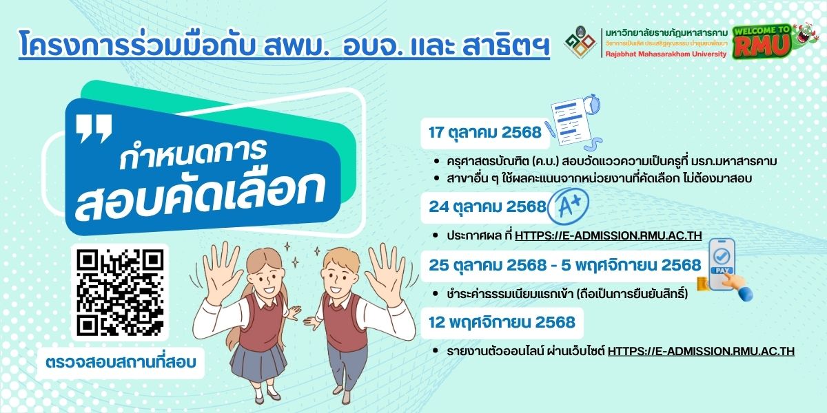 - ครุศาสตรบัณฑิต (ค.บ.) สอบวัดแววความเป็นครูที่ มรภ.มหาสารคาม สถานที่สอบ อาคาร 26 อาคารศูนย์ภาษา(คณะเทคโนโลยีสารสนเทศ) ชั้น 2 ห้องอบรม 1-6
